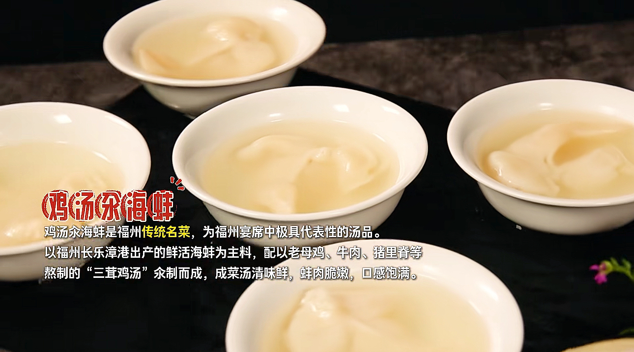 剧中,被朱枫(吴越饰)赞叹“鲜得眉毛都要掉了”的鸡汤汆海蚌,是福州传统名菜,为福州宴席中极具代表性的汤品。鸡汤汆海蚌以鲜活海蚌为主料,配以老母鸡、牛肉、猪里脊等熬制的“三茸鸡汤”汆制而成,汤清味鲜,蚌肉脆嫩,口感饱满。该菜品因选料考究、工艺精细,被列为闽菜经典之一。2022年2月,入选国家《地标美食名录》。
