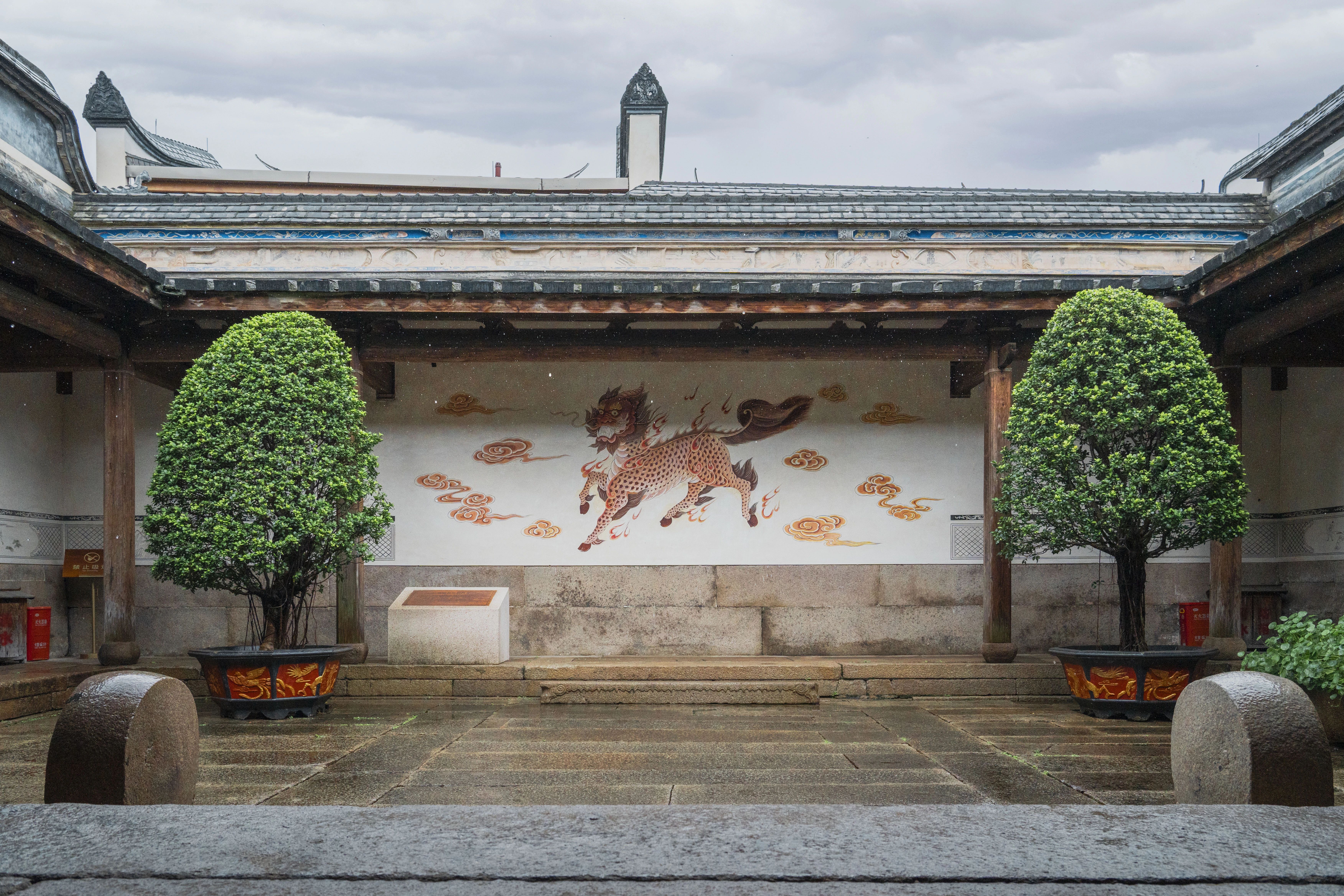 宅院南面照壁上有精美的灰塑独角兽“獬豸”,这是明代大理寺公堂的标志。