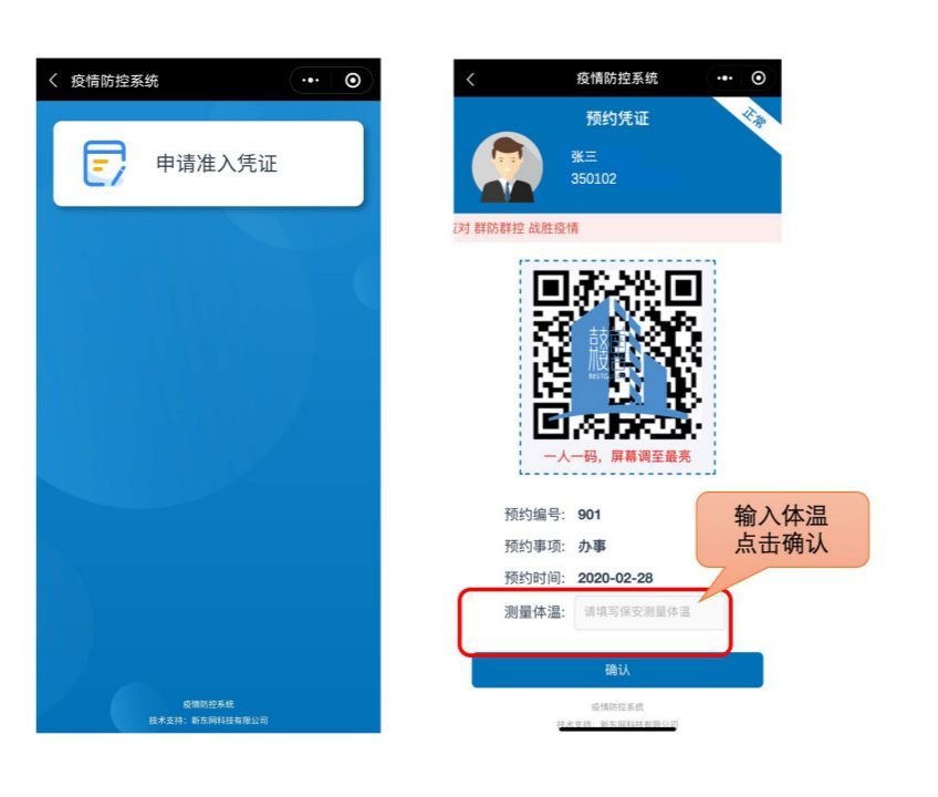 前来办事的预约群众可通过小程序获取自己的预约信息,在手动输入现场测量的体温信息后,即可生成预约凭证进场办理。此举有效减少了办事群众与工作人员的肢体接触,降低风险,同时进一步提升预约确认效率,助力审批服务和健康安全防护双到位。