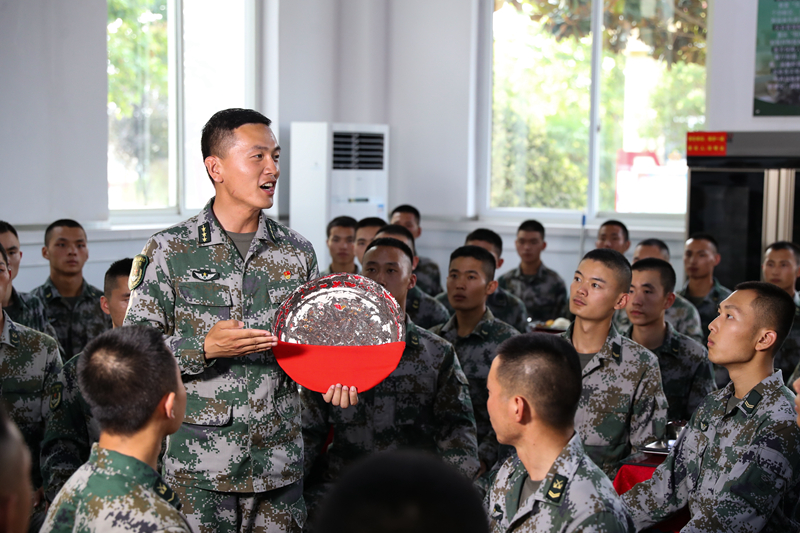 陆军第83集团军某旅“红一连”指导员郑纪文为官兵讲述连队传家宝“红菜盘”背后的故事(2021年6月13日摄)。新华社发(姜东坡 摄)