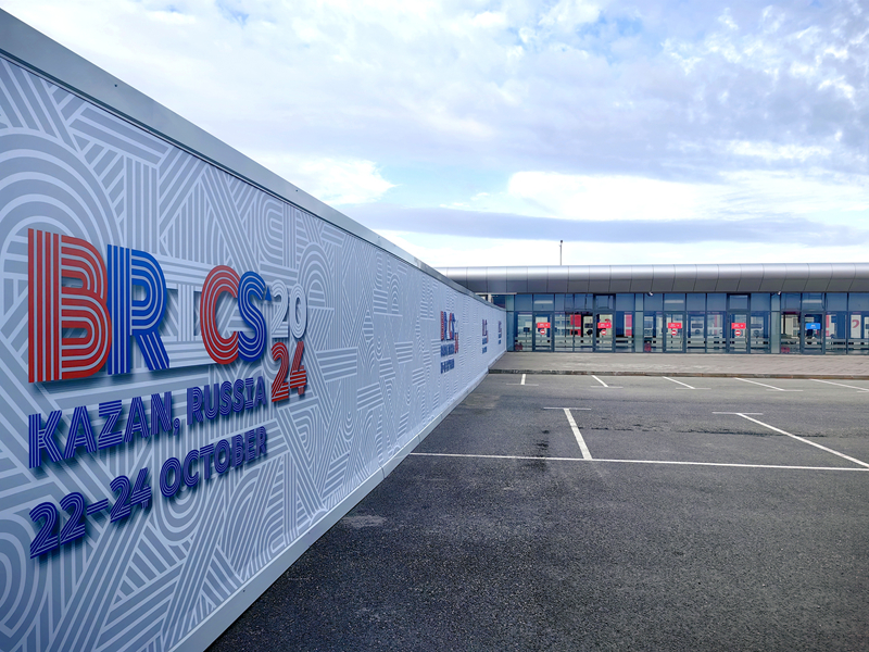 这是2024年10月24日在俄罗斯喀山拍摄的金砖峰会标识和国旗。新华社记者 李学仁 摄
