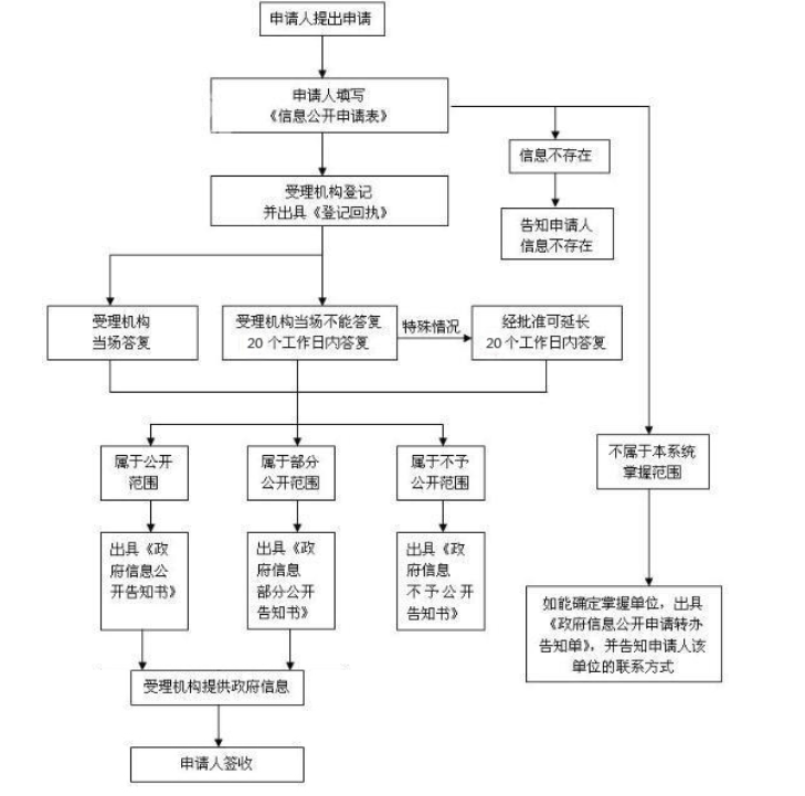 受理机构收到《申请表》后向申请人出具回执。能够当场答复的当场答复,不能当场答复的,自收到申请之日起20个工作日内作出下列书面答复: