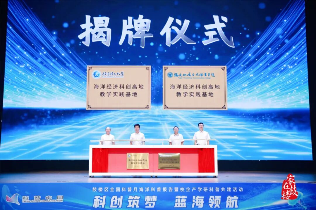 在随后举行的校企共建教育及实践基地揭牌仪式上,福建理工大学智慧海洋学院党委书记王强、福建船政交通职业学院安全与环境学院院长陈明仙和鼓楼区科协主席林锋、鼓楼区国投集团董事长陈伟共同为“海洋经济科创高地教学实践基地”与福建船政交通职业学院“安全与环境学院实践教育基地”正式揭牌,象征着鼓楼区通过校企合作模式开展科普教育事业的全新探索。
