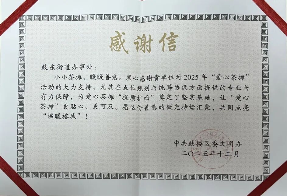 近日,鼓楼区委文明办为2025年爱心茶摊活动的参与者送上饱含敬意的感谢信,鼓东街道多家茶摊凭借优质贴心的便民服务、始终如一的公益坚守,收获了这份认可。