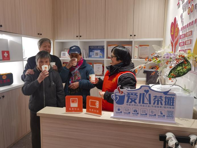 自设立以来,这里不仅为外卖、快递骑手等户外劳动者提供免费饮水和临时休息处,还提供手机充电、饭食加热、应急药品等服务,更搭建起沟通桥梁。骑手小哥们建言献策,积极融入基层治理,让服务与治理双向赋能。爱心茶摊夏送清凉,冬送温暖,既让暖“新”服务更贴心,更传递了榕城的人文关怀,织密了新就业群体关爱网,切实提升了新业态新就业群体的归属感与幸福感。