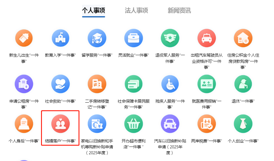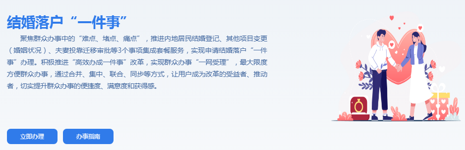 聚焦群众办事中的“难点、堵点、痛点”,推进内地居民结婚登记、其他项目变更(婚姻状况)、夫妻投靠迁移审批等3个事项集成套餐服务,实现申请结婚落户“一件事”办理。积极推进“高效办成一件事”改革,实现群众办事“一网受理”,最大限度方便群众办事,通过合并、集中、联合、同步等方式,让用户成为改革的受益者、推动者,切实提升群众办事的便捷度、满意度和获得感。