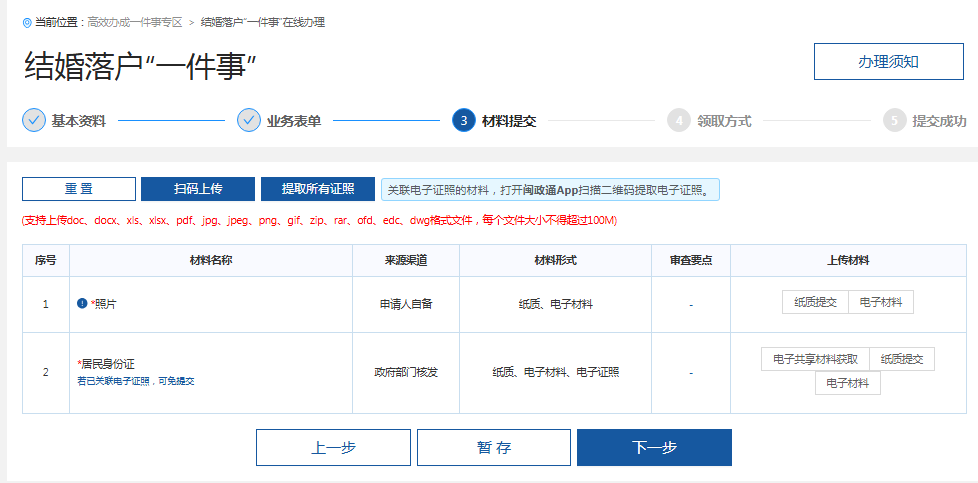 6.上传材料,点击“下一步”。点击【提取所有证照】,进行人脸核验,调用电子证照。对调用不到的,选择“电子材料”或“纸质提交”,其中*为必要材料,其他根据情况上传。