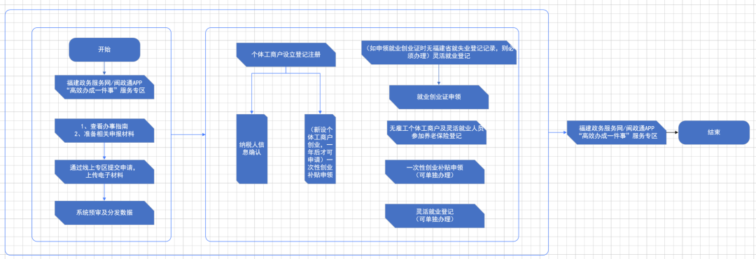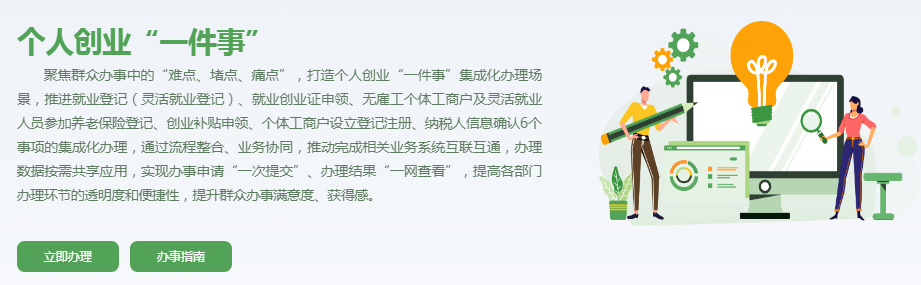 聚焦群众办事中的“难点、堵点、痛点”,打造个人创业“一件事”集成化办理场景,推进就业登记(灵活就业登记)、就业创业证申领、无雇工个体工商户及灵活就业人员参加养老保险登记、创业补贴申领、个体工商户设立登记注册、纳税人信息确认6个事项的集成化办理,通过流程整合、业务协同,推动完成相关业务系统互联互通,办理数据按需共享应用,实现办事申请“一次提交”、办理结果“一网查看”,提高各部门办理环节的透明度和便捷性,提升群众办事满意度、获得感。