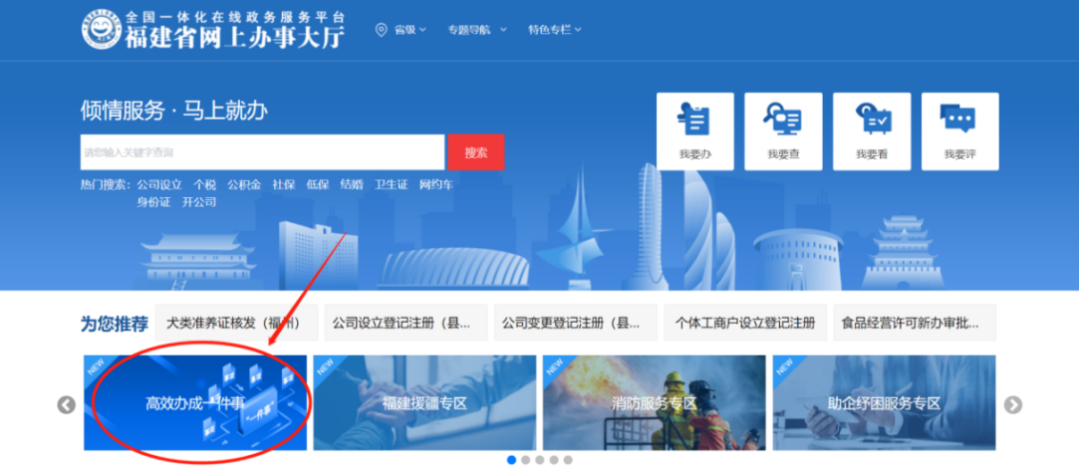 1.打开“福建省网上办事大厅”后,选择个人登录,点击“高效办成一件事”进入专区,点击个人创业“一件事”进入申报入口,点击“立即办理”,选择“鼓楼区”。
