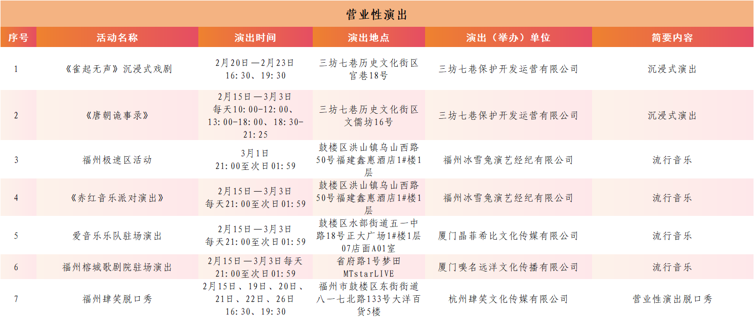 春节期间,鼓楼的演出市场同样精彩纷呈。今年,沉浸式戏剧成为一大亮点,尤其在三坊七巷历史文化街区,福建人民艺术剧院推出的《雀起无声》、《唐朝诡事录》等剧目,将在古厝实景中带你“入戏”过年,真正实现“戏在巷中,人在戏里”。此外,喜欢轻松爆笑的观众可以前往剧场欣赏脱口秀;榕城歌剧院与各Livehouse也将带来多场音乐演出,用旋律点燃新春之夜。