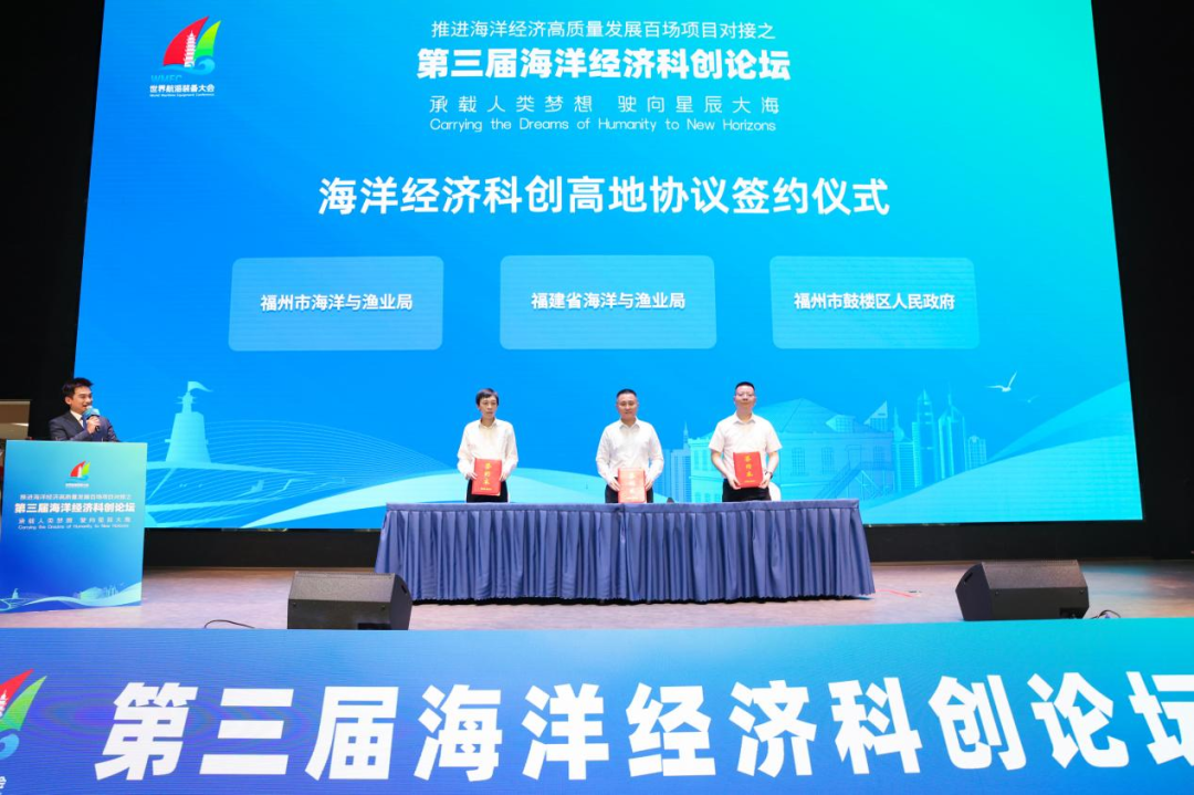 在合作协议签订环节,福建省海渔局、福州市海渔局和鼓楼区人民政府进行海洋经济科创高地协议签约。