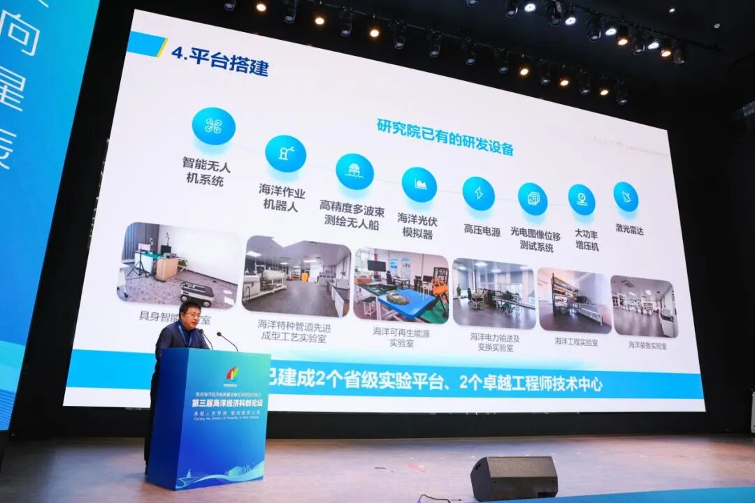东南大学南通海洋高等研究院副院长、教授张熠作“海洋工程建造与运维成果汇报”主题演讲。演讲围绕“历史积淀、当下攻坚、赋能价值”三大主题,分享了海洋工程建造中心的研发成果,并指出了存在问题和未来效益。
