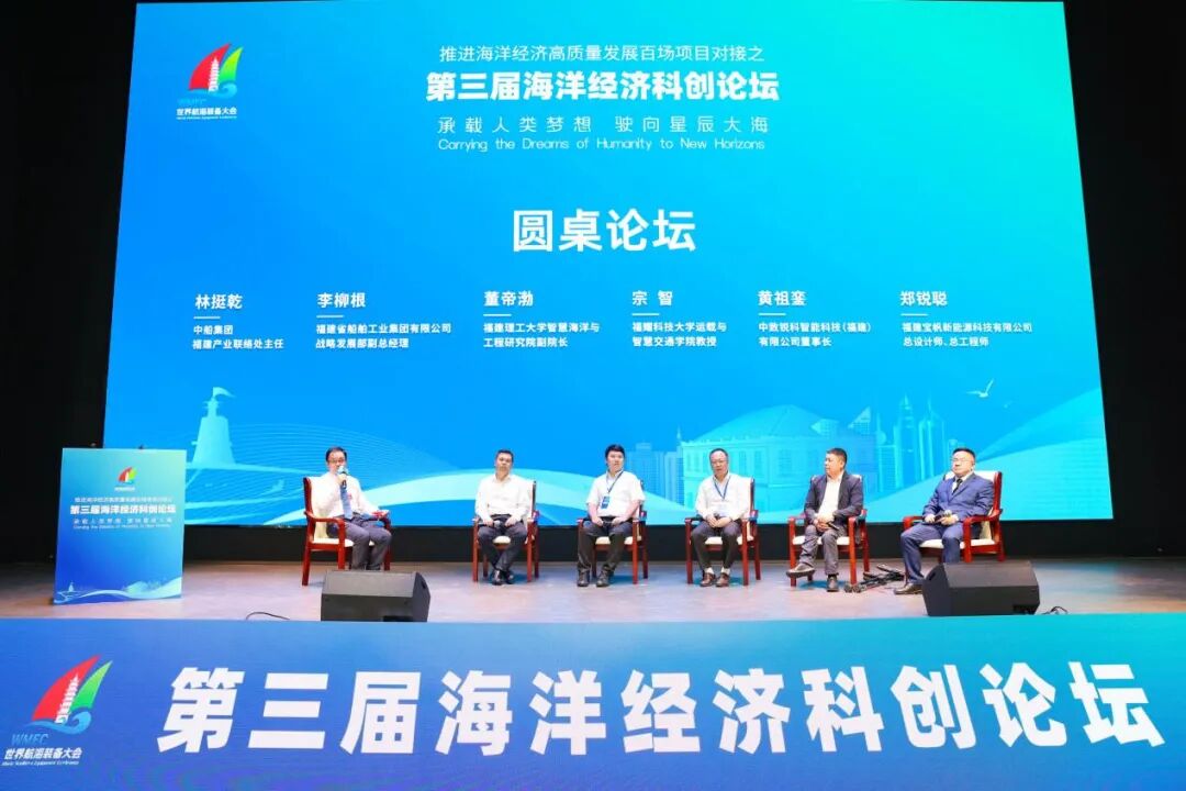 活动最后,进行圆桌论坛环节。该环节由中国船舶集团福建产业联络处主任林挺乾主持,福建理工大学智慧海洋与工程研究院副院长董帝渤,福耀科技大学运载与智慧交通学院教授宗智,福建省船舶工业集团战略发展部副总经理李柳根,中致锐科董事长黄祖銮,福建宝帆新能源总设计师、总工程师郑锐聪等6位专家学者围坐在一起,围绕“闽船领航:海洋新能源船舶的福建机遇与路径”主题展开自由讨论。在座专家深入探讨海洋经济科创高地建设蓝图,让更多“金点子”转化为推动福建海洋经济高质量发展的“实举措”。