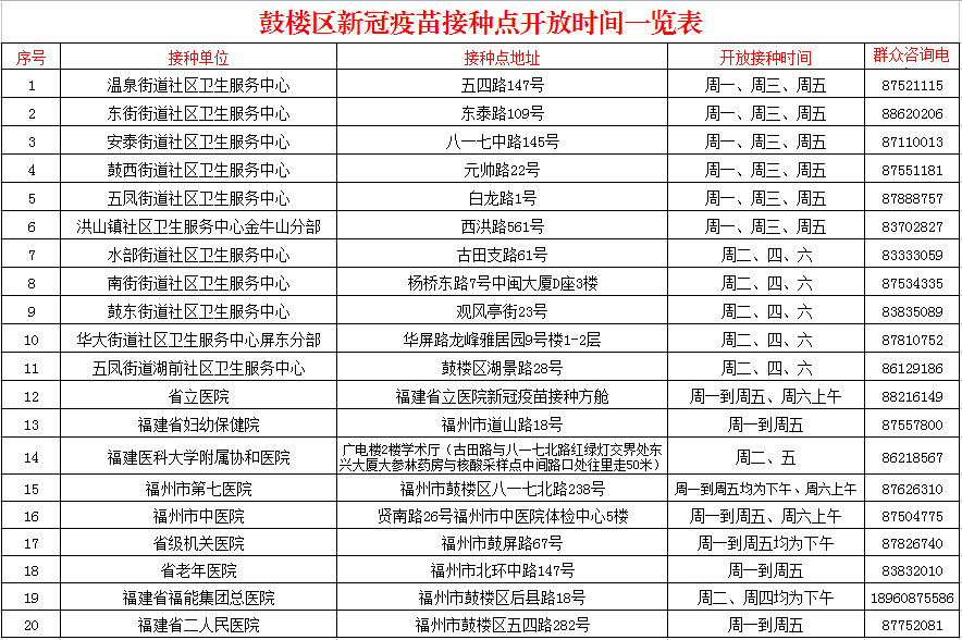 5月1日-5月15日鼓楼区新冠疫苗接种点开放时间一览表