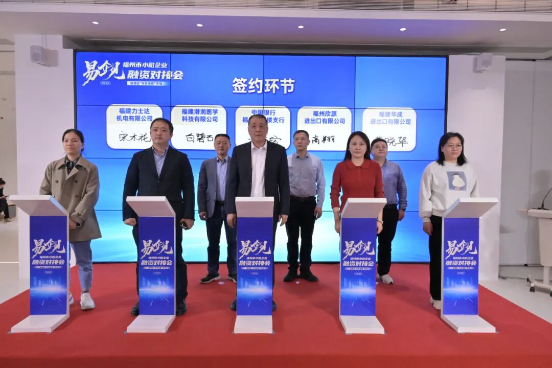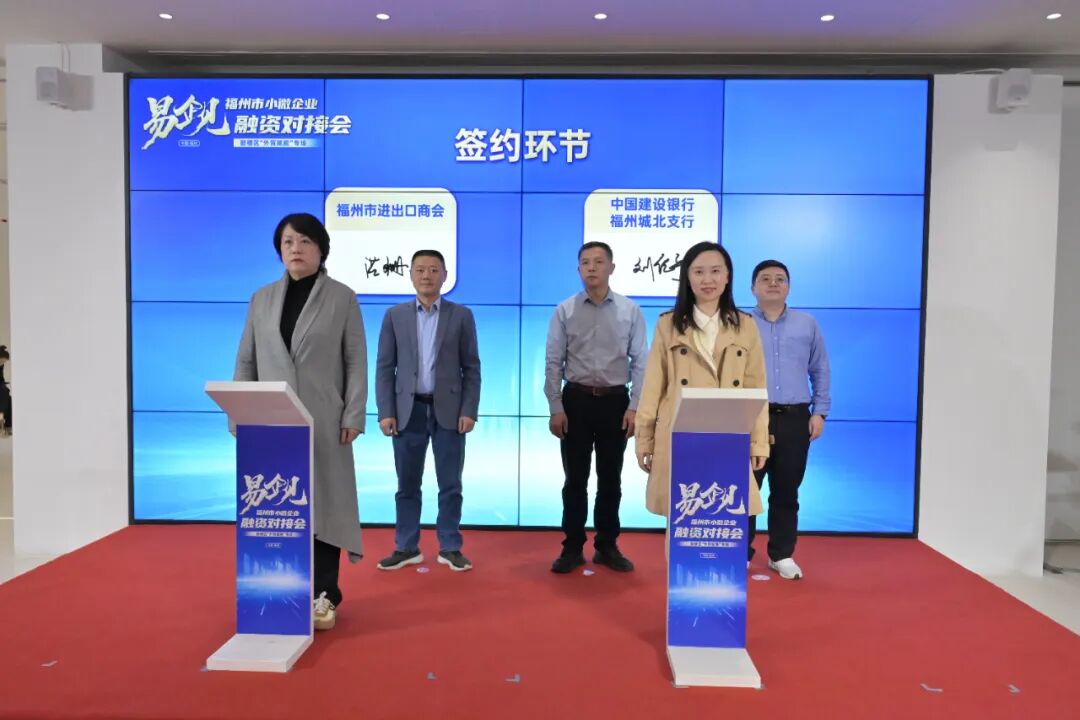 在全场嘉宾的共同见证下,对接会迎来高潮,福建潜润医学科技有限公司、福建力士达机电有限公司、福州欣源进出口有限公司、福建华成进出口有限公司、福州市进出口商会等5家外贸企业/协会与金融机构现场合作签约。