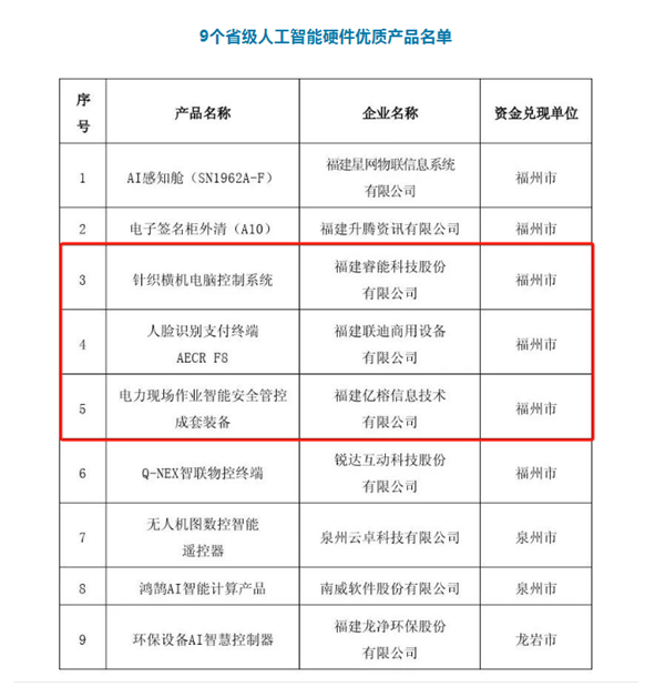近日,福建省工业和信息化厅公布了省级人工智能硬件优质产品名单,全省9家企业产品上榜,其中睿能科技、联迪商用、亿榕信息为鼓楼企业,入选数量占全省总数1/3,总量全市第一。