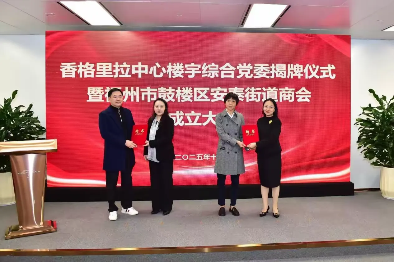 安泰街道党工委书记黄勉在致辞中表示,香格里拉中心楼宇综合党委和安泰街道商会的成立,不仅是安泰街道在强化党建引领、凝聚企业共识、服务区域发展进程中的关键一步,更为构建政企联动、资源共享、发展共赢的新格局筑牢了坚实根基。安泰街道作为底蕴深厚的历史文化街区,企业云集、商业氛围浓厚,而香格里拉楼宇地处福州城市中轴核心,区位优势显著。未来,安泰街道将积极推动香格里拉中心楼宇内跨行业开展“党建联建共建”,努力将其打造为党建工作的“新高地”和营商环境的“示范点”。同时,全力支持商会发挥桥梁纽带作用,促进企业间信息互通、产业协同、资源共享,并引导辖区企业参与“山水安泰”建设,助力南门兜站TOD项目立体消费空间建设与“文旅影商”融合发展,共同擦亮“宜居、宜业、宜游、宜养、宜学、宜创”的安泰名片,为鼓楼打造现代化国际城市“最美窗口”作出更多贡献。