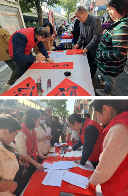 义写春联现场墨香四溢、暖意融融,书法志愿者们凝神挥毫、笔走龙蛇,将新春的美好祝愿融入一笔一画之中,“骏马奔腾开胜景,春风浩荡展宏图”“邻里同心传暖意,闽都志愿送安康”等一幅幅寓意吉祥、饱含温情的春联跃然红笺。