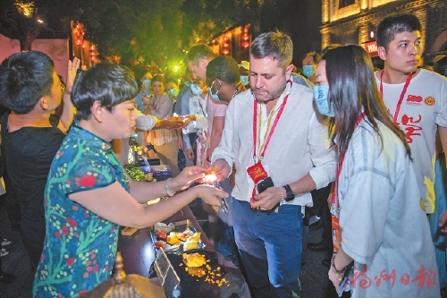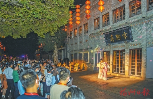 热闹的街头,元宵花灯盏盏亮起;人力车夫摇着铃铛,拉着客人消失在巷尾;有人舞灯,有人舞龙,有人耍木偶;“叮叮叮”,这里在敲畲银,“嗨哟嗨哟”,那里在打肉燕……昨晚,置身南后街,让人仿佛穿越时光,来到明清时期烟火气息浓厚的闽都坊巷。这是三坊七巷沉浸式演出《寻梦·坊巷》的表演现场。作为第44届世界遗产大会重要组成部分,《寻梦·坊巷》让八方来宾久久沉浸在演出中,感受闽都文化的神奇魅力,收获与众不同的感官体验和视觉盛宴。