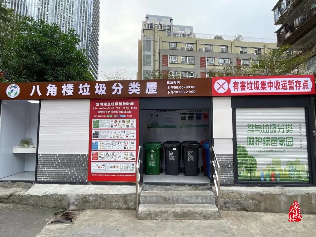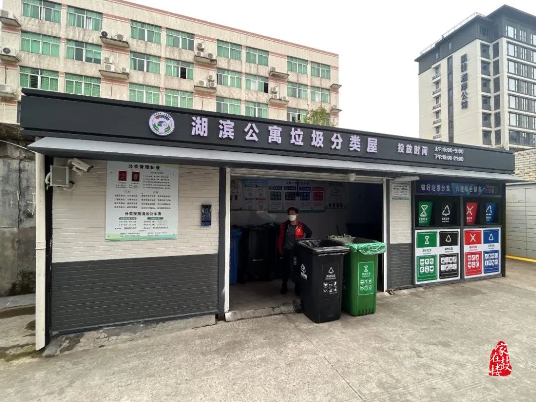 科学优化设施配套,提升改造垃圾分类屋。整治整改的40座屋亭严格按照省厅建设标准,改建为外观时尚、设备设施配置齐全的垃圾分类屋亭,分类管理工作标识等全面更新,同时还配备干净明亮洗桶区域,有效提升分类屋亭整体干净整洁度,与有害垃圾点、环保驿站形成一体,大大解决了各小区居民群众垃圾投放难的问题。