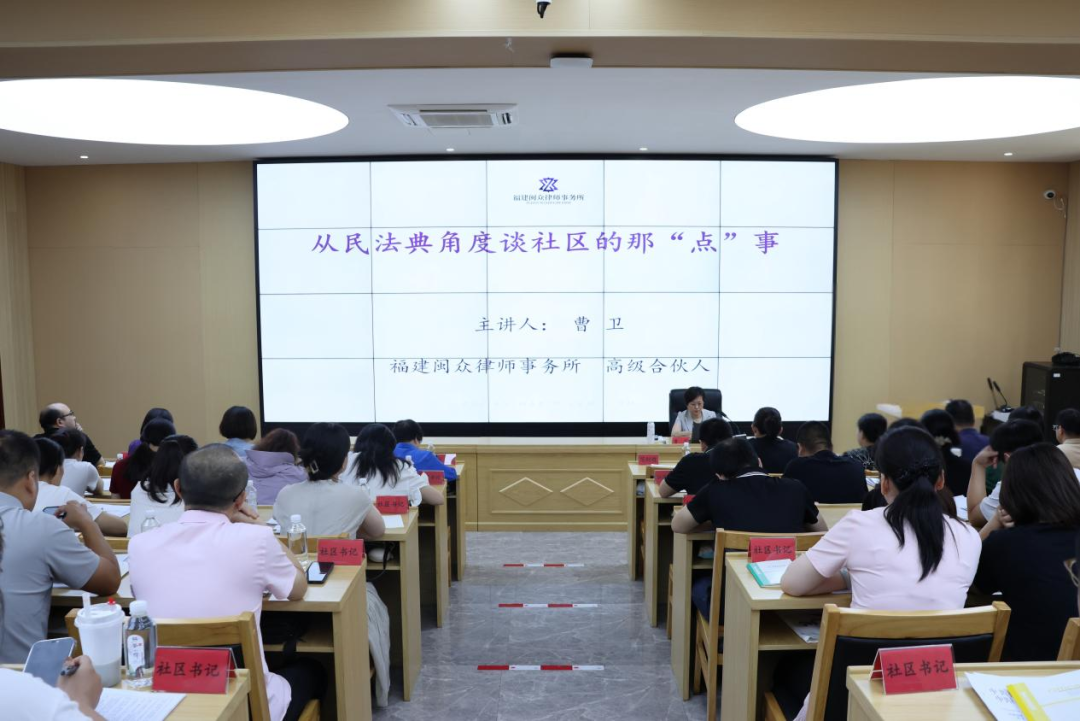 本次培训,特别邀请了福建闽众律师事务所高级合伙人、福州市政协委员曹卫律师,为大家作专题讲座——“从民法典角度谈社区的那‘点’事”。