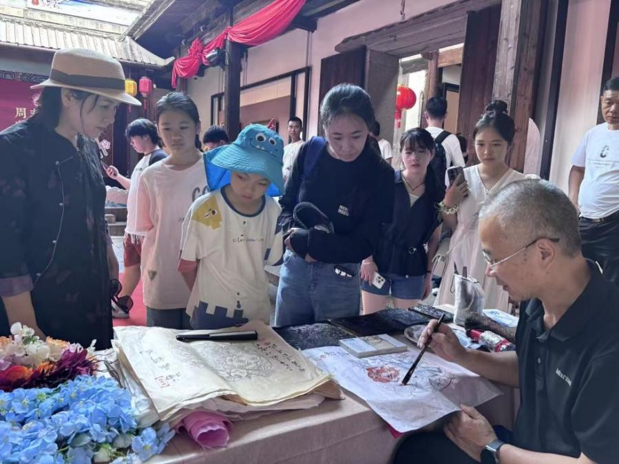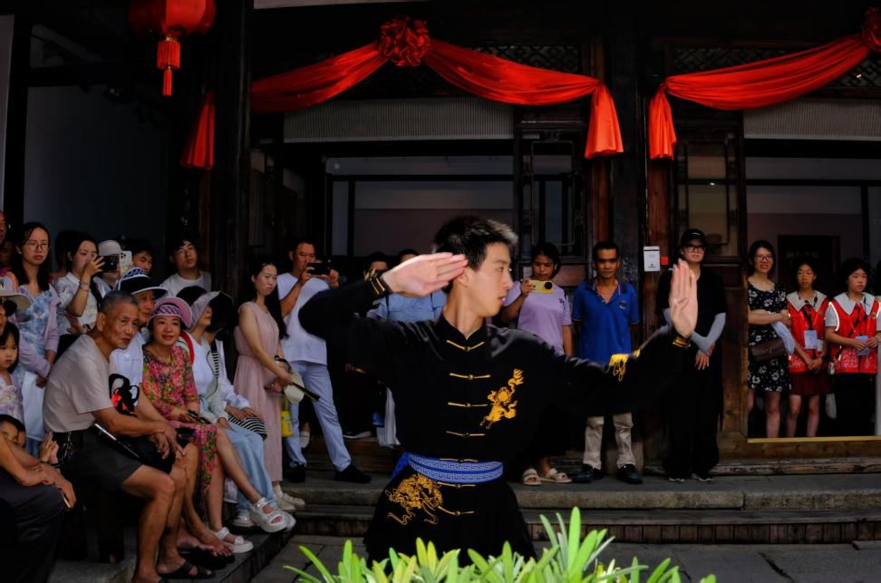 “周末戏相逢 非遗正青春”主题展演活动突破舞台边界,将精彩有趣的节目搬进古厝,泉州鲤城火鼎公火鼎婆、福州伬艺、儒家拳、上乘梅花拳、闽剧、闽西客家木偶戏等非遗代表性项目在博览苑分时段上演,游客们在天井聚拢围观,纷纷拍手叫绝、喝彩连连。