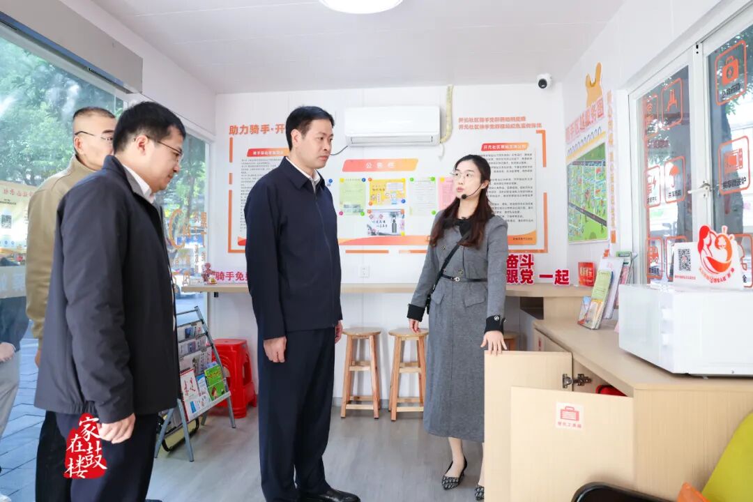 刘用全一行先后前往鼓东街道骑手驿站、福州市敏锦伟业快递有限公司和华大街道屏山社区,实地察看骑手驿站、快递驿站设施配备和维护管理情况,详细了解新兴领域党建、非公党建和社区党建工作开展情况。