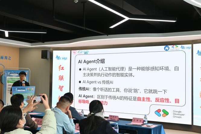 在智能体开发浪潮中,工作流、RPA与智能体平台已成为核心工具。围绕这一主题,谷歌机器学习专家陈榆现场解析其原理与范式,并演示从零搭建个性化AI智能体;字节跳动技术专家Nayuta则分享移动端实践,演示任务规划与GUI智能体如何协同,在无需App接口的情况下,通过多模态阅读与模拟操作,完成订票、旅游等任务;福州GDG核心组织者尤泽扬以电商为例,展现AI编程智能体如何赋能非技术人员,全流程高效实现项目从开发到上线,做到“一人成军”。三场报告从理论到实例,全面呈现智能体技术的前沿应用。