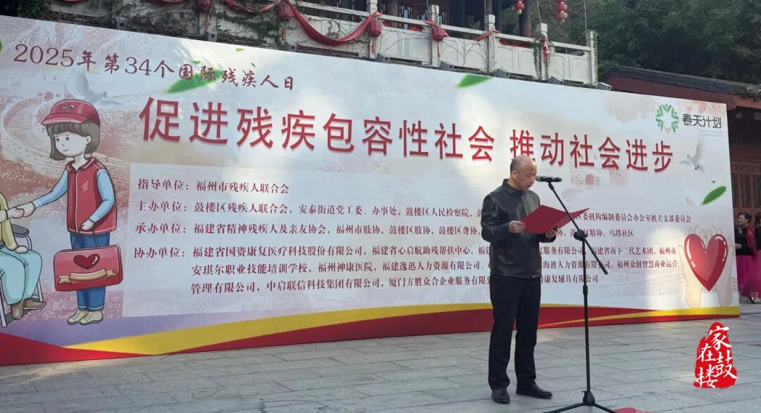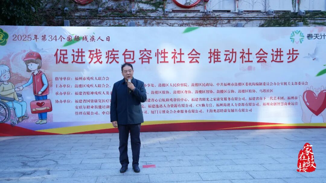 福州市残联副理事长项颐枫致辞,对鼓楼区残疾人工作给予充分肯定。他指出,鼓楼区一年来扎实推进“春天计划”,在无障碍改造、就业帮扶、驿站服务等方面精准施策、亮点突出。他呼吁更多爱心企业、社区组织和志愿者力量加入到扶残助残事业中来,形成“人人关心、人人支持、人人参与”的良好格局。同时,他勉励残疾人朋友继续发扬“自尊、自信、自强、自立”精神,坚定信心、勇毅前行,在各自岗位上创造更加精彩的人生。