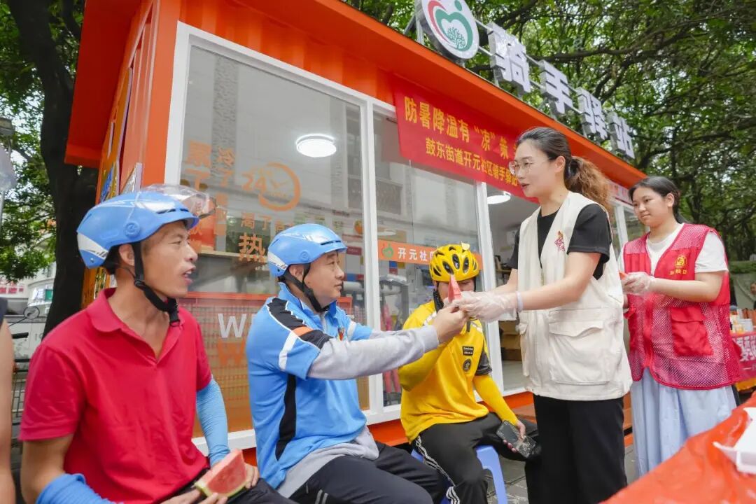 坐落于鼓东路与尚宾路交叉口的开元社区骑手驿站爱心茶摊,是户外劳动者的“能量补给站”,更是新就业群体参与社区治理的“实践舞台”。