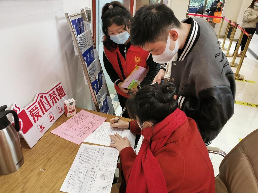 2月14日是情人节,许多新人相约在这个有纪念意义的日子来办理结婚登记,同时也迎来婚检、孕前优生检查“小高峰”。在这个新人扎堆登记结婚的日子里,温泉街道东大社区的工作人员充分发挥专业优势,来到婚姻登记大厅,向准新人们送上了新婚祝福“大礼包”——免费婚检、孕前优生健康检查、免费增补叶酸预防神经管缺陷项目等惠民服务政策普及和妇幼健康知识现场咨询。