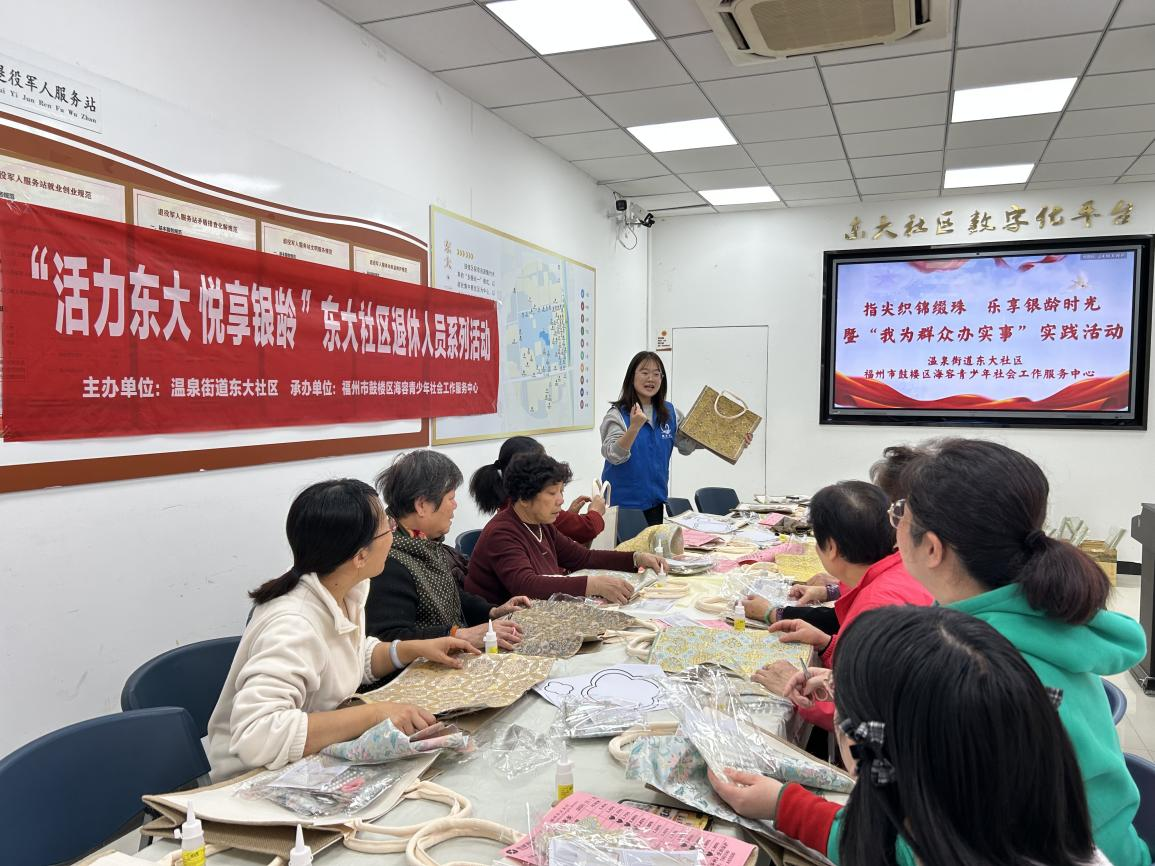 为丰富长者的精神文化生活,传承弘扬中华优秀传统文化,匠心打造锦绣生活。2025年12月17日,东大社区开展“指尖织锦缀珠 乐享银龄时光”暨“我为群众办实事”实践主题活动。让社区长者、银发人才们用指尖感受非遗文化的魅力气息。