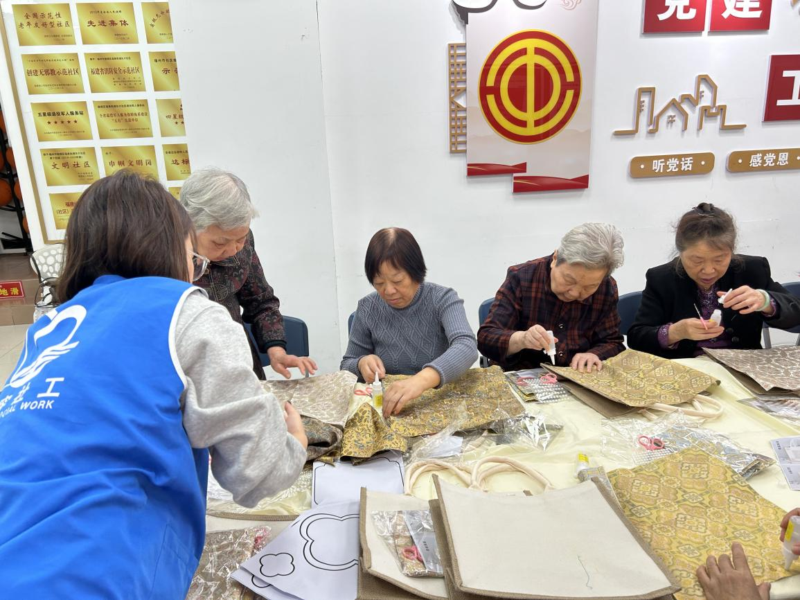 活动现场,鼓楼区海容社工在职党员首先介绍了宋锦这一非物质文化遗产的历史渊源、工艺特点及其在丝绸文化中的重要地位。随后,长者们在老师的耐心指导下,亲手体验宋锦珍珠包的制作过程。从材料选择、剪裁搭配到穿针引线、缝合装饰,在细致的手作中感受非遗技艺的精妙与传统美学的韵味。长者们在动手动脑的愉悦体验中,深切感受到了社区的温暖关怀和中华优秀传统文化的独特魅力。