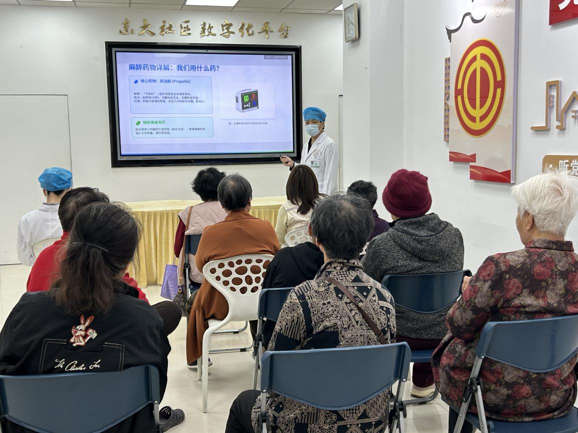 活动以“告别恐惧,舒适就医----睡梦中完成胃肠镜检查”医学相关知识科普主题讲座拉开序幕,福建中医药大学附属第二人民医院在职党员龙波医生为居民们讲解麻醉的奥秘,让大家了解如何进行无痛胃肠镜诊疗过程以及从检查前的准备手续到治疗后的苏醒全流程诊治工作。有效增强居民对医疗健康知识的了解,有效缓解居民对医疗检查的紧张。