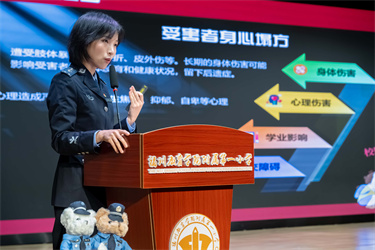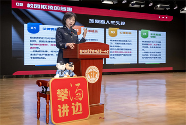 讲座伊始,来自福建省女子监狱六监区十七分监区的政治指导员苏婕婷,以某地初中生围殴事件视频切入,引发学生对校园欺凌的重视。