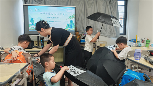 进入实践环节,孩子们兴奋不已,迅速领取了雨伞、栩栩如生的龙形模板和缤纷的丙烯颜料笔便投入了创作。孩子们认真固定模板,精心挑选色彩为龙身着色。创作时,大家热烈交流分享,有的设计渐变色彩显灵动,有的添上立体龙鳞增质感,空白伞面很快便跃出栩栩如生的龙影。每一把伞都独一无二,尽显青少年丰富的内心与卓越的创造力。