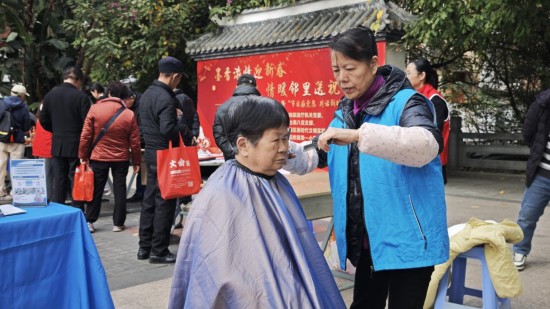 爱心义剪摊位前,理发师耐心询问居民需求,细致地修剪发型,让老人们清爽迎新春;口腔检查与爱心义诊专区,医护人员认真为居民测量血压、检查口腔健康,用专业服务守护居民健康。