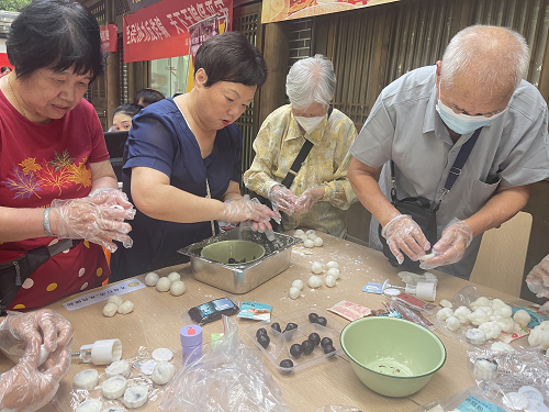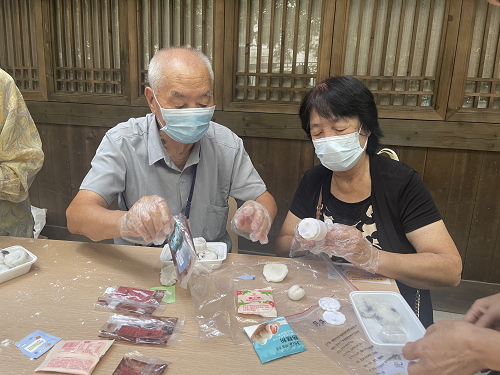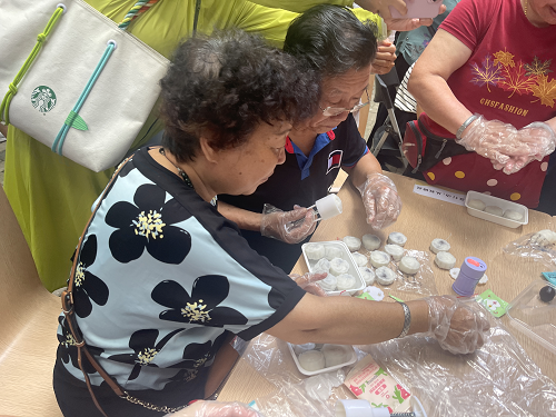 活动现场欢声笑语,其乐融融,大家围成一桌,戴上手套,在志愿者们的带领下,大家分工协作,和面、压皮、包馅、定型,井然有序,很快一块块精致可爱冰皮月饼从大家的巧手中诞生,每个人脸上都洋溢着幸福的笑容。