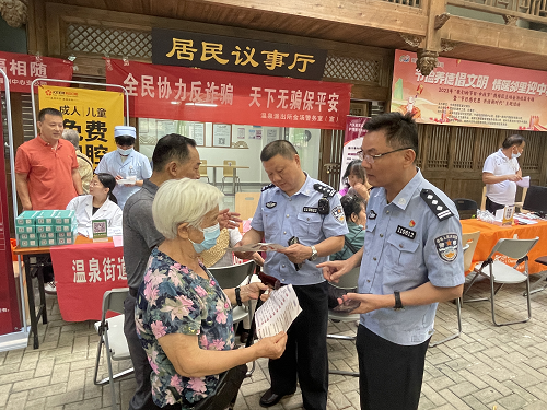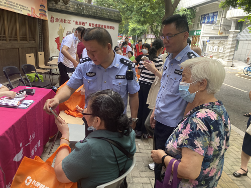 活动过程中,金汤社区民警、法务特派员陈秀明为居民普及电信诈骗防范知识,帮助居民注册国家反诈中心APP,同时发放防诈骗、扫黑除恶、禁毒、反邪教、平安建设宣传手册。