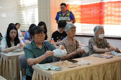 理论宣讲结束后,活动进入了轻松愉悦的非遗手工体验环节。在手工老师的带领下,居民们兴致勃勃地动手制作起传统艾草养生锤,大家将蓬松的艾草仔细填入棉布中心,包裹成紧实的球形,随后将木柄稳稳地插入艾草球中心,这是锤子发力的关键所在。最后是考验耐心和技巧的捆扎步骤,用长棉绳从球顶开始缠绕,一圈圈向下,最后打上结实的结,一个清香四溢、古朴实用的艾草锤就制作完成了。小小的艾草锤,一方面是让大家感受非遗文化的魅力,放松身心;另一方面也是借此隐喻:诚信正身、增强防骗‘免疫力’,就如同这艾锤的保健作用一样,能为我们抵御外界‘邪祟’(诈骗风险)的侵袭,守护安全。