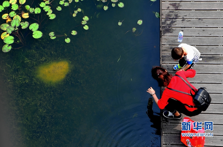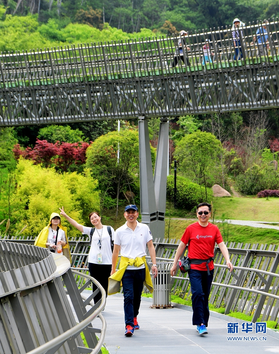 4月14日,游客在“福道”中段的梅峰山地公园湖边玩耍。 新华社记者 魏培全 摄
