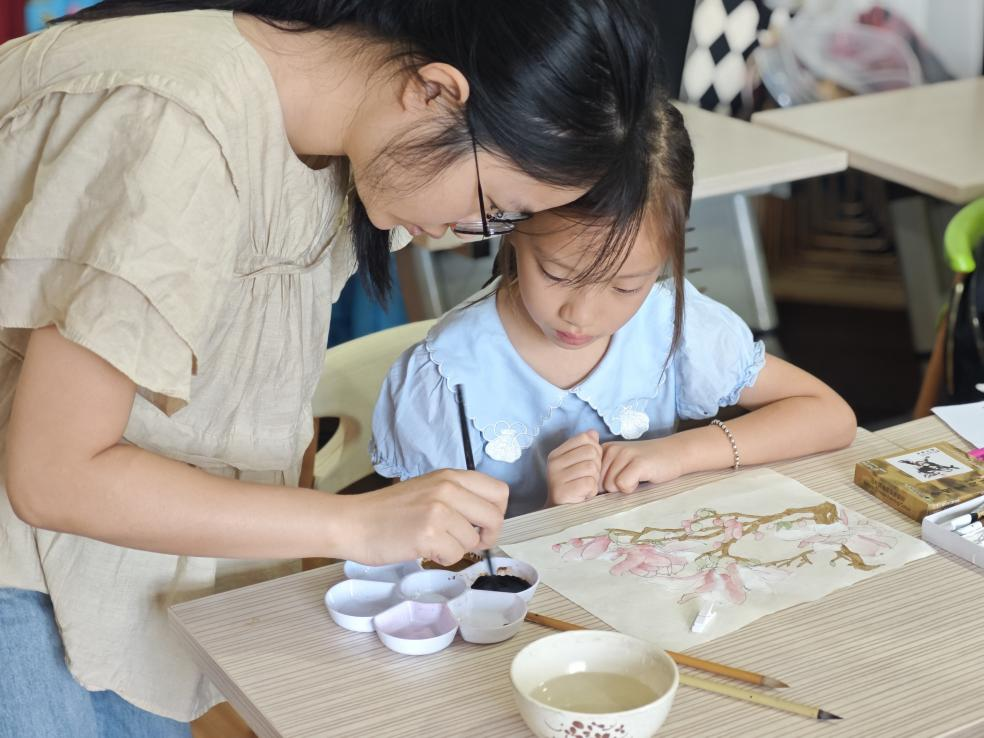 孩子们从笔墨技法入门,最终完成了3-4幅山水、花鸟作品,宣纸之上,水墨晕染间满是传统美学的韵味。