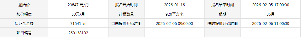 2、网上报名时间:意向承租人应于2026年2月5日17时前至本平台(www.salp.com.cn)注册用户名,登录账号进入“标的申请管理”→“标的公告”→选择对应的标的点击“申请竞价”,在线提交竞租申请。(见本网站首页服务帮助操作说明)