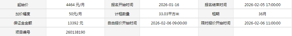 3、竞租标的的月租金按下列公式计算:月租金=最终成交价格,成交单价按竞价结果确定。