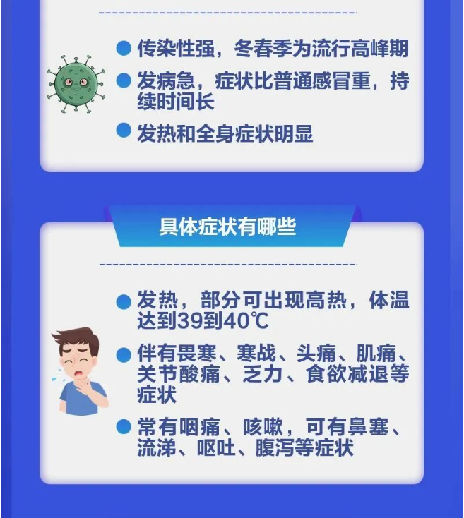 流感一般表现为急性起病、发热(部分病例可出现高热,达39℃~40℃),可有畏寒、寒战,多伴全身肌肉关节酸痛、乏力、食欲减退等全身症状,常有咽喉痛、干咳,可有鼻塞、流涕、腹泻等症状。
