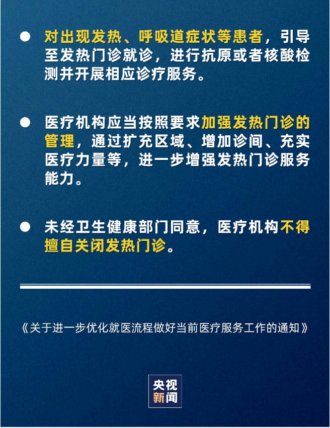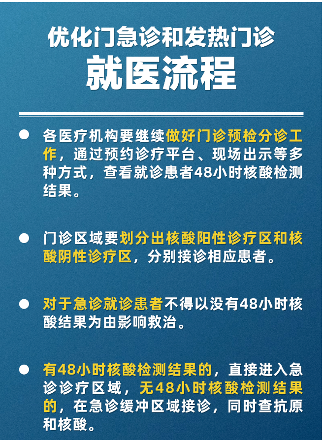 12月7日,国务院联防联控机制发布《关于进一步优化就医流程做好当前医疗服务工作的通知》,强调要相应调整医疗机构诊疗流程,优化检测要求和医疗机构诊疗区域布局,最大限度提高医疗资源可用程度,最大程度保障就医秩序安全有序。要点如下: