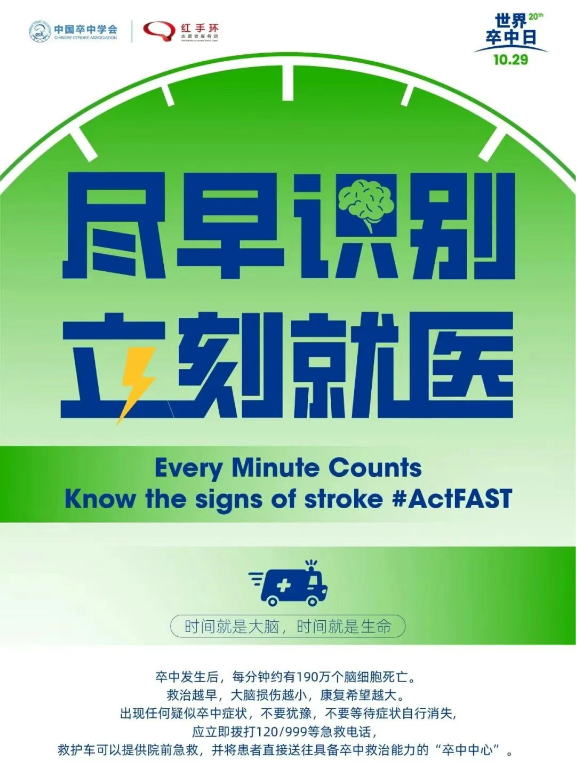 2.建议不要自行驾车或打车去医院!救护车上的医护人员可以进行初步救治,并提前通知医院启动“卒中绿色通道”,为患者赢得宝贵时间。