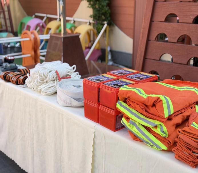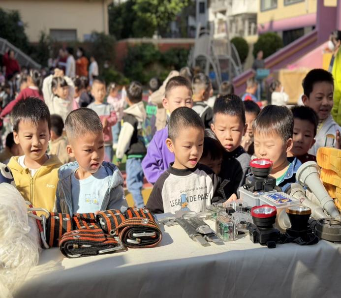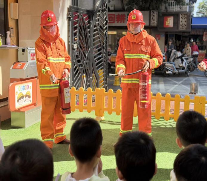 警报解除后,安全专干林老师对演练进行总结,肯定师幼沉着有序的表现,强调危险时刻需听从指挥、做好自我保护。随后针对不同年龄段幼儿设计提问互动,巩固安全知识;保安与教师现场讲解消防器材用途,组织幼儿体验消防服,以沉浸式互动深化幼儿安全认知,现场氛围热烈。