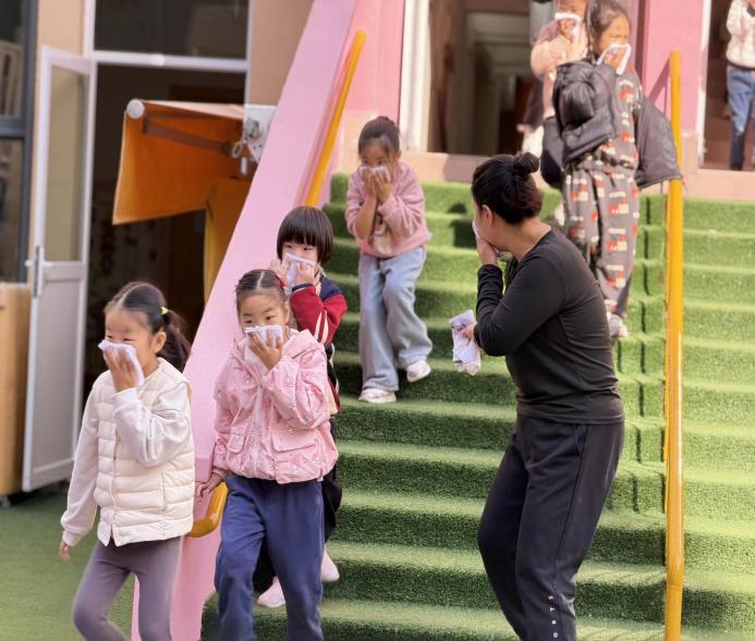 上午9:50,急促的警报声响起,演练正式启动。各班教师秉持“安全第一”原则,按预定路线、方向引导幼儿捂住口鼻、弯腰小步快走,有序向安全出口撤离。全程幼儿情绪稳定,无推搡、拥挤、争抢现象,3分钟内快速抵达户外安全地带后,教师立即清点人数并上报,整体过程井然有序、沉着高效。