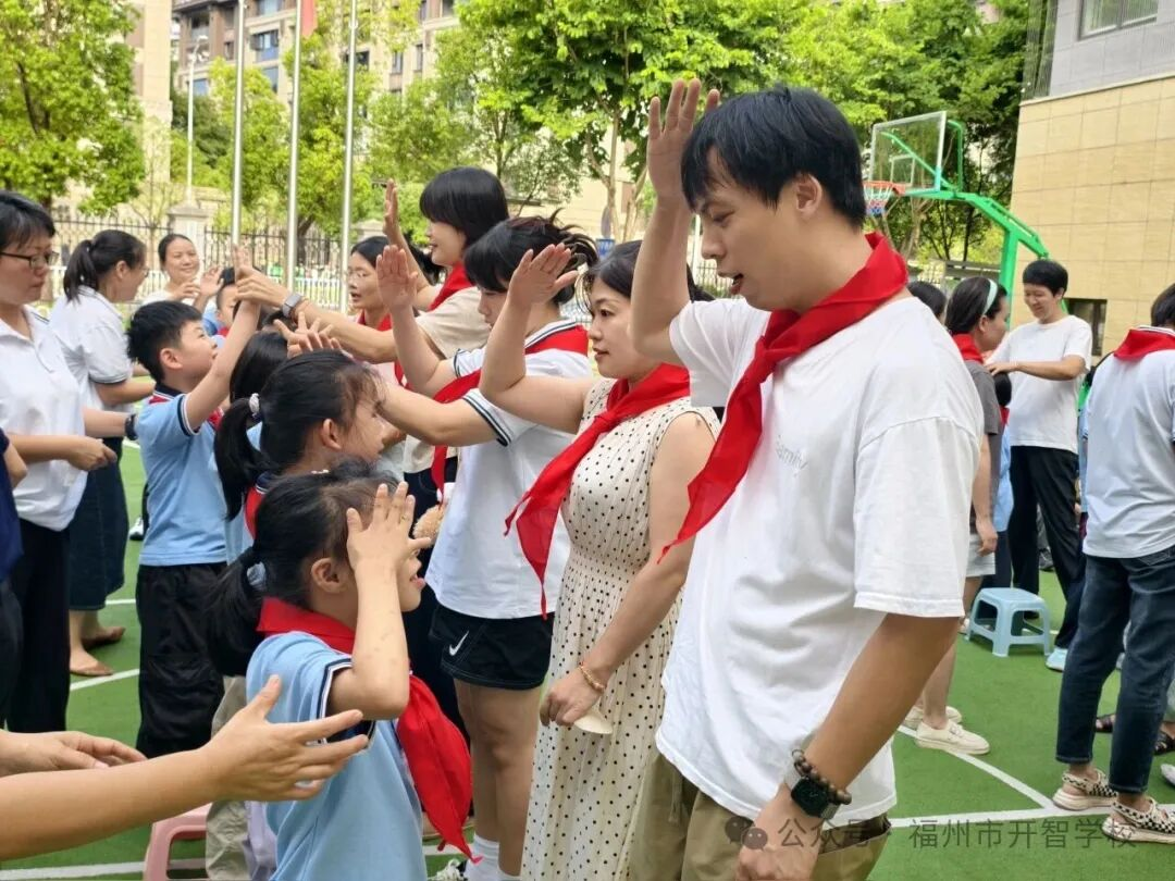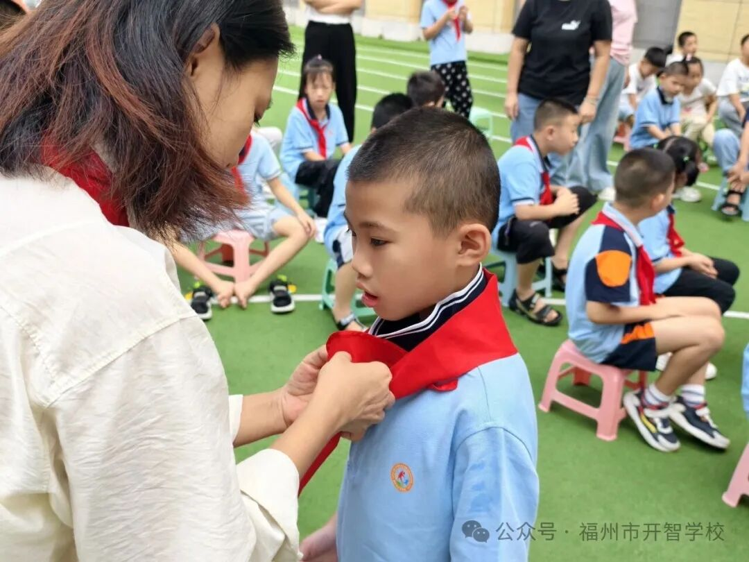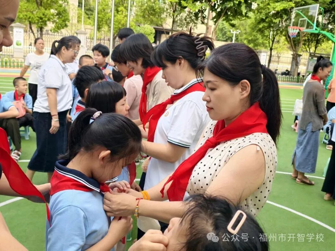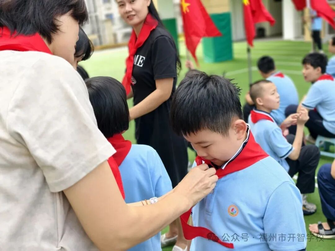 最庄严的时刻属于新队员。经过组织的考核,二年级的17名同学正式被批准加入中国少年先锋队。中队辅导员们为新队员佩戴上人生中第一条鲜艳的红领巾。